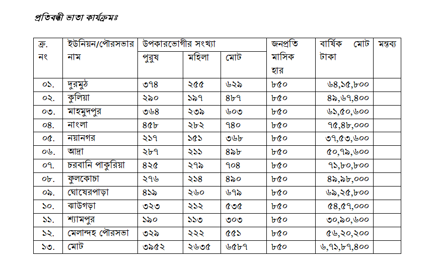 উপজেলা সমাজসেবা কার্যালয়, মেলান্দহ, জামালপুর হতে সামাজিক নিরাপত্তা কর্মসূচীর আওতায় অসচ্ছল প্রতিবন্ধী ভাতা পায় মোট ৬,৫৮৭ (ছয় হাজার পাঁচশত সাতাশি) জন। প্রতি একজন অসচ্ছল প্রতিবন্ধী ভাতাভোগী মাসে পায় ৮৫০/- টাকা। তাহলে ১বছরে ১ জন পায় ১২×৮৫০=১০২০০/- টাকা। তাহলে দেখা যায় যে অত্র উপজেলা হতে অসচ্ছল প্রতিবন্ধী ভাতা বাবদ বছরে বিতরণ করা হয় ১০২০০×৬,৫৮৭= ৬,৭১,৮৭,৪০০/-(মোট ছয় কোটি একাত্তর লক্ষ সাতাশি হাজার চারশত টাকা)।