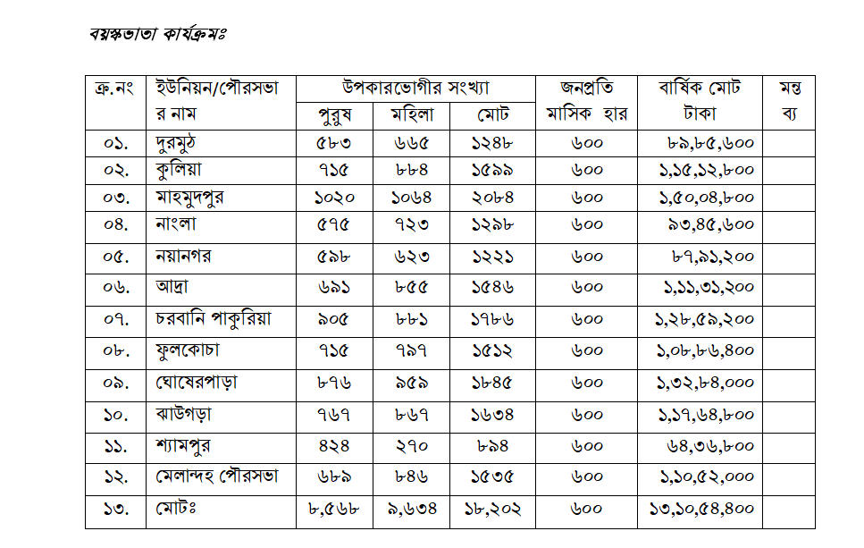 উপজেলা সমাজসেবা কার্যালয়, মেলান্দহ, জামালপুর হতে সামাজিক নিরাপত্তা কর্মসূচীর আওতায় বয়স্ক ভাতাভোগী হিসেবে ভাতা পাচ্ছেন ১৮২০২ জন।জনপ্রতি একজন বয়স্ক ভাতাভোগী মাসে ৬০০/-(ছয়শত টাকা) পেয়ে থাকেন। তাহলে দেখা যায় যে, একজন বয়স্ক ভাতাভোগী ০১ বছরে ০১ জন ভাতা পাচ্ছেন ১২×৬০০=৭২০০/-(সাত হাজার দুইশত) টাকা। সেই হিসাবে বছরে অত্র উপজেলা থেকে বয়স্ক ভাতা বাবদ ৭২০০×১৮,২০২=১৩,১০,৫৪,৪০০/- টাকা।(মোট তেরো কোটি দশ লাখ চুয়ান্ন হাজার চারশত) টাকা বিতরণ করা হচ্ছে।